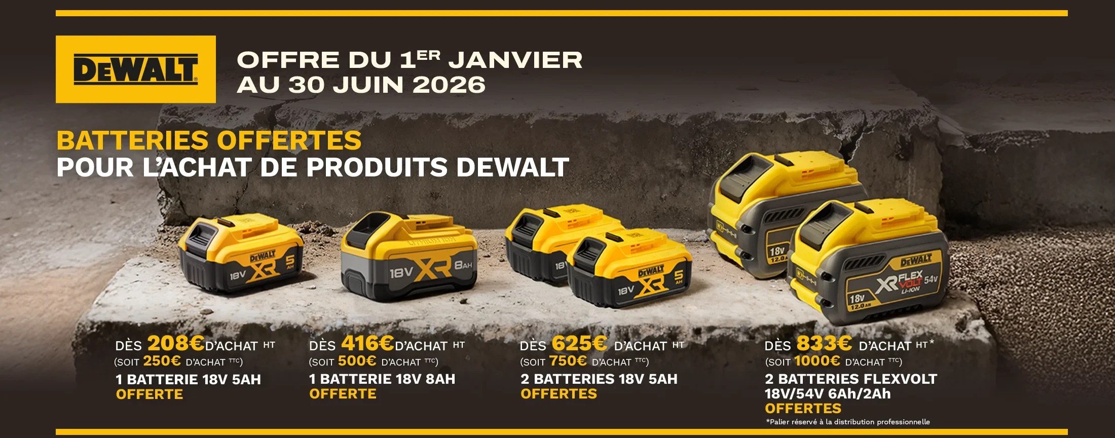 DEWALT propose une offre exceptionnelle : du 1er janvier au 30 juin 2026, pour tout achat simultané d’un ou plusieurs produits DEWALT, vous pouvez recevoir une batterie offerte (ou un pack de batteries) selon le montant total de vos achats.