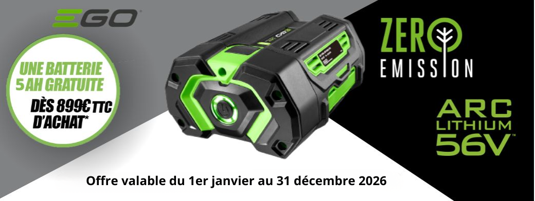 Chez Webmotoculture, nous vous offrons gratuitement une batterie EGO 5Ah pour un achat de matériel EGO d'un montant supérieur ou égal à 899€ TTC.